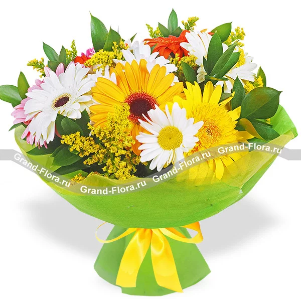 Стандартный (на фото): ромашка белая - 6 шт, гербера разноцветная (белая, розовая, оранжевая, малиновая, желтая) - 9 шт, солидаго 4 шт, рускус, фетр зеленый.
