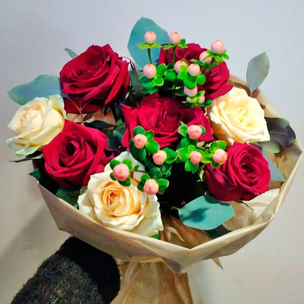 ДЕЛЮКС: роза красная - 11 шт., роза кремовая кустовая - 10 шт., эвкалипт - 5 шт., гиперикум - 4 шт.т( Возможна замена на иные ягоды), упаковка, лента. Примерный размер: 45Х45 см.