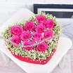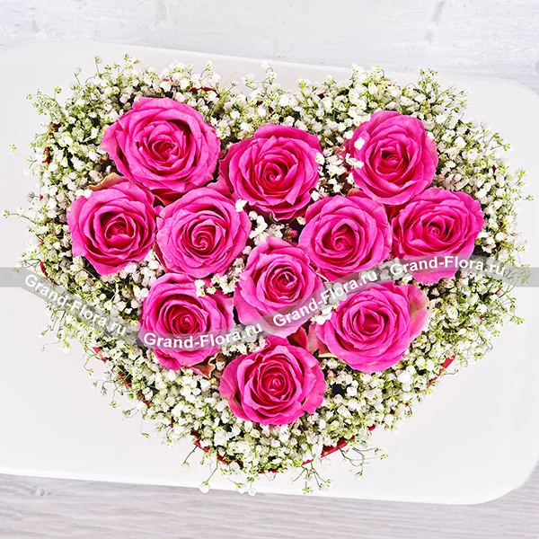 11 роз (на фото): роза розовая - 11 шт., гипсофила, оазис сердце малое. Примерный размер: 25Х25 см.