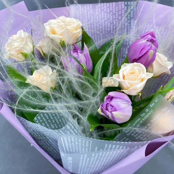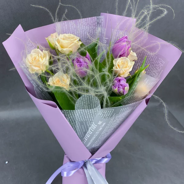 Стандартный: тюльпан сиреневый(розовый) - 5 шт., роза кустовая кремовая(белая) - 4 шт., упаковка, лента